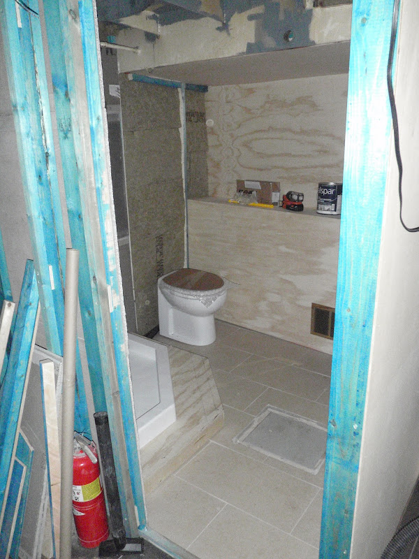 Inside the head. There’s the shower base and the toilet setup. We have to finish the ceiling first before this is hooked up but we wanted to see what the place would look like. The sink will be going where this photo was taken basically.